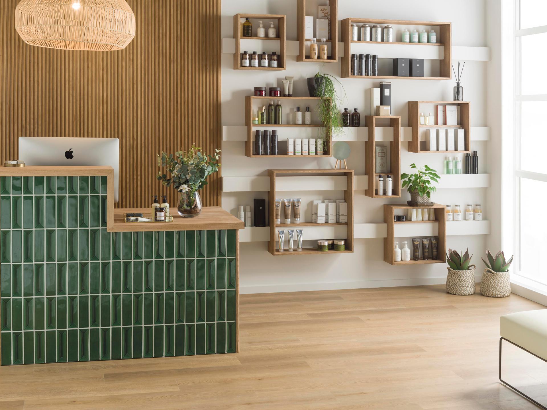 Dekoracyjne panele, wnęki i pasy świetlne z Bruma Green tworzą ekskluzywny efekt inspirowany designem spa i butikowych hotelowych lobby.