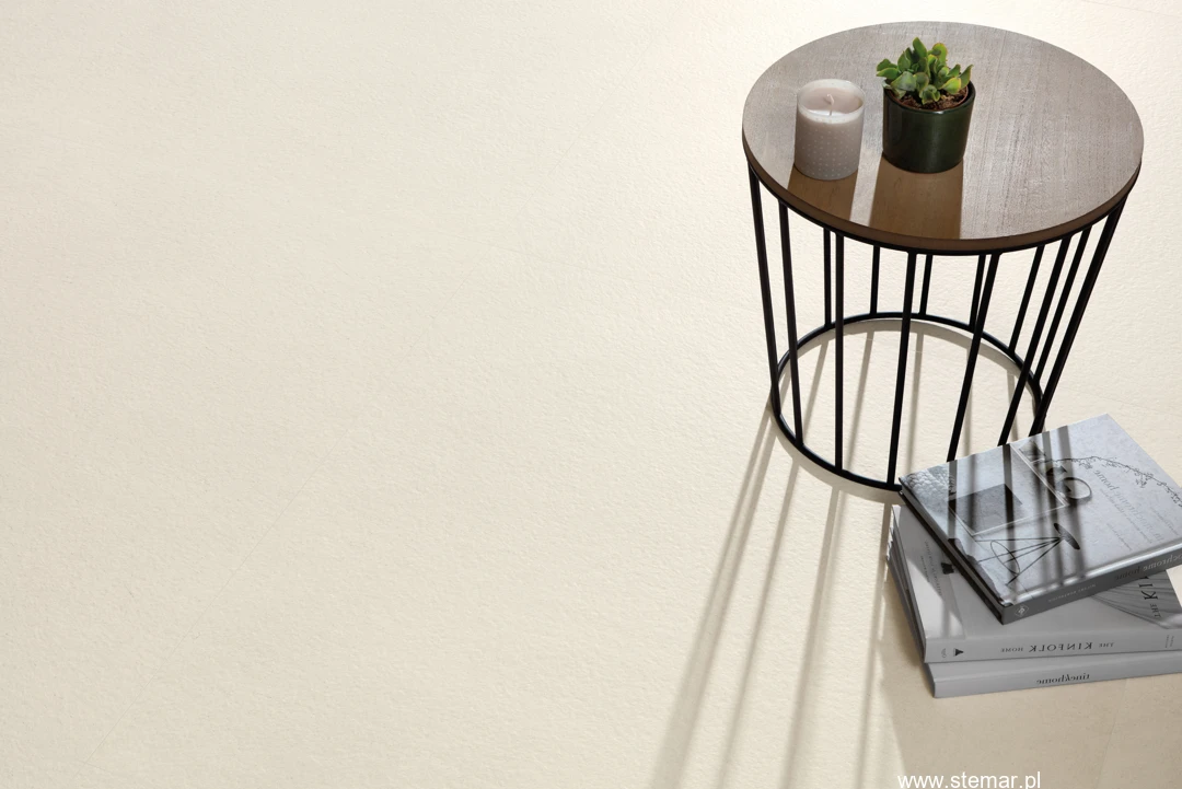 Płytki o matowej powierzchni prezentują subtelny odcień bieli, dodając wnętrzom świeżości i jasności. Dodatkowo, efekt tekstury bush hammered nadaje powierzchni charakterystyczną fakturę, co sprawia, że płytki są zarówno eleganckie, jak i wyjątkowo trwałe.
