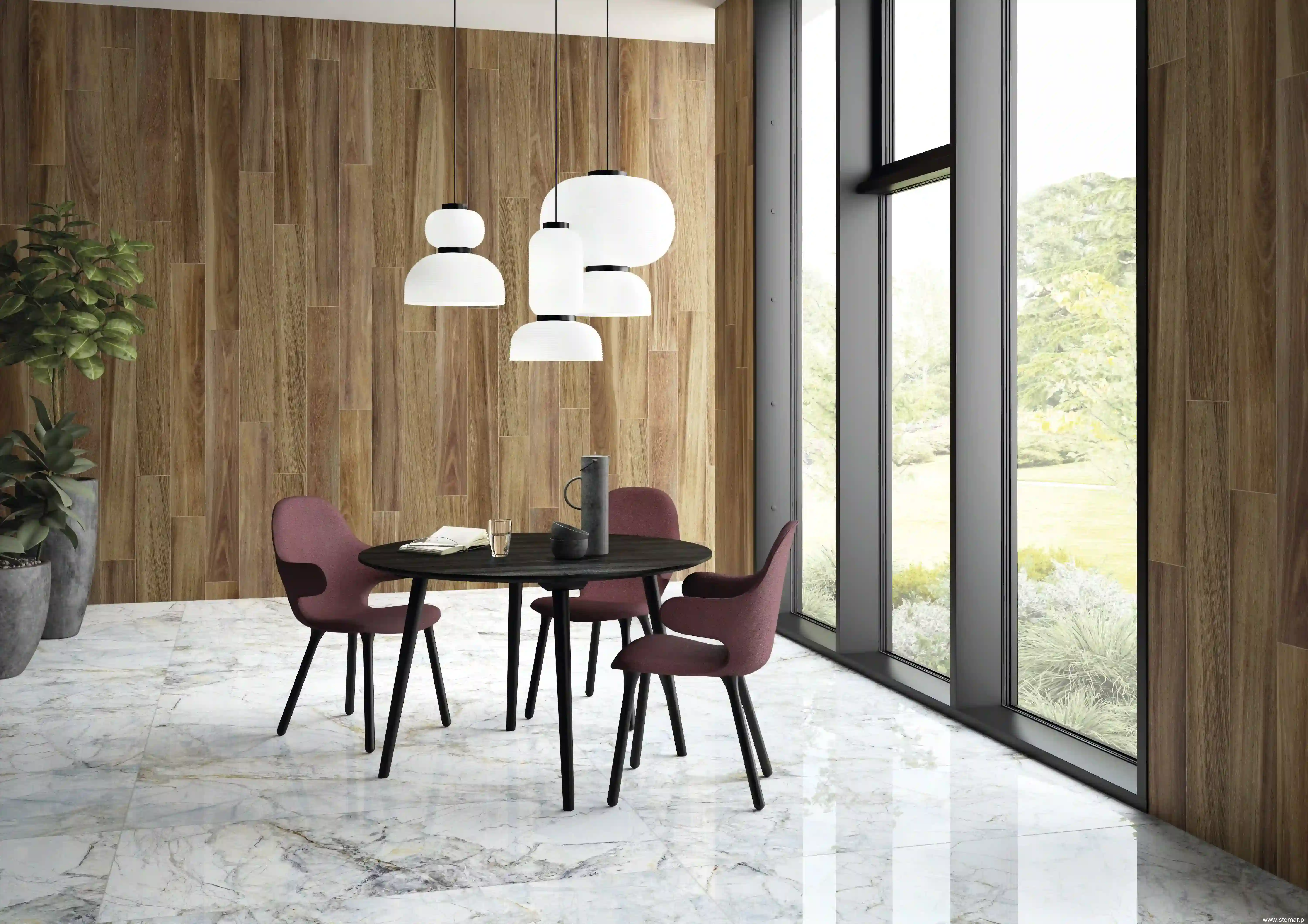 - Salon i jadalnia – podłoga o marmurowym charakterze, która dobrze współgra z drewnem, tkaninami i nowoczesnym oświetleniem.