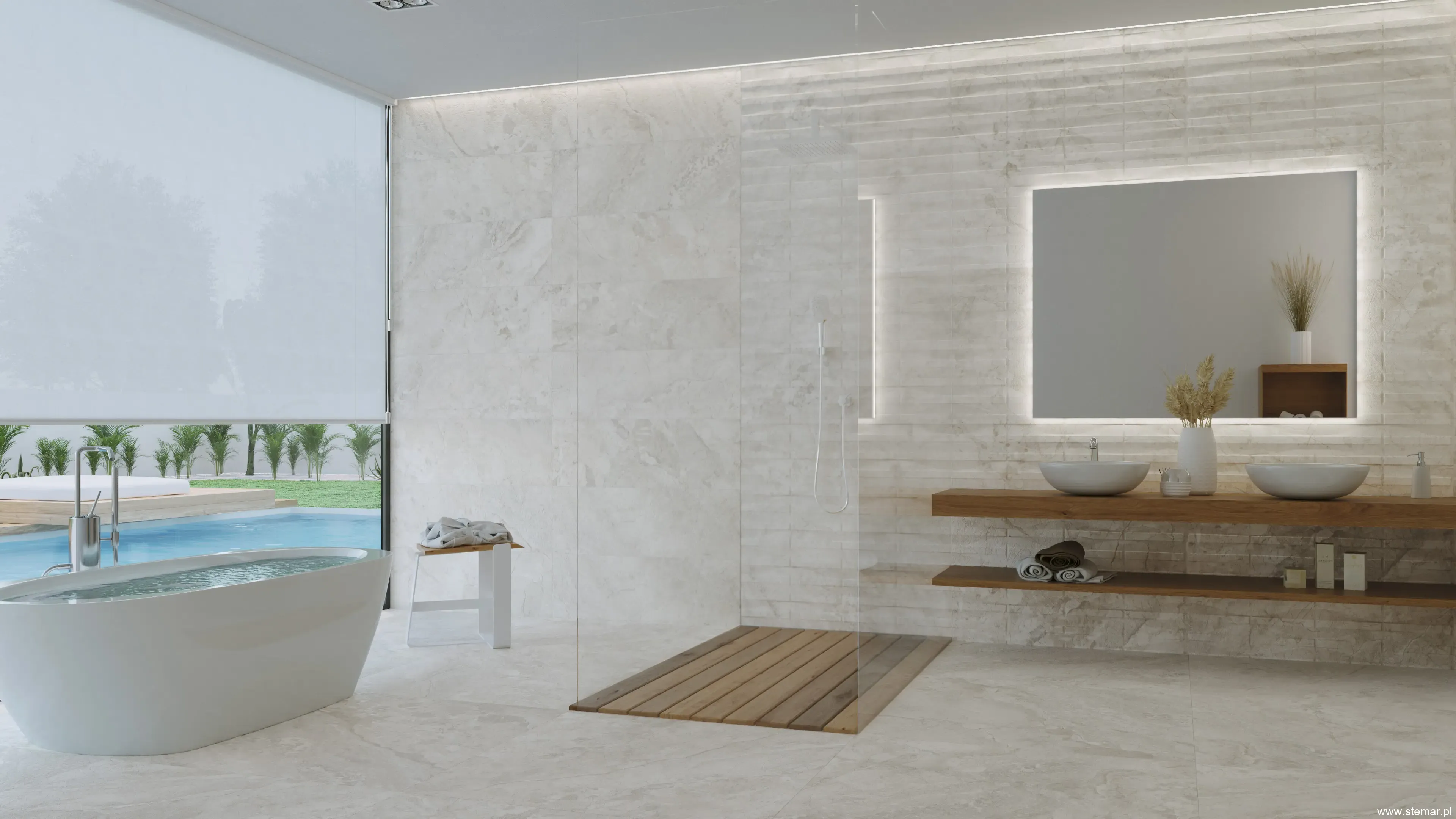 - Łazienka domowa – podłoga i ściany, w tym strefa prysznica walk-in; mat i antypoślizgowość poprawiają komfort użytkowania.