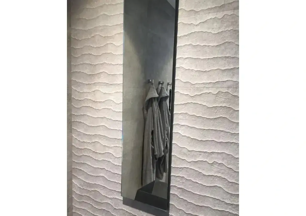 - Strefa prysznica – estetyczne, matowe wykończenie i relief tworzą efekt „ściany architektonicznej”.