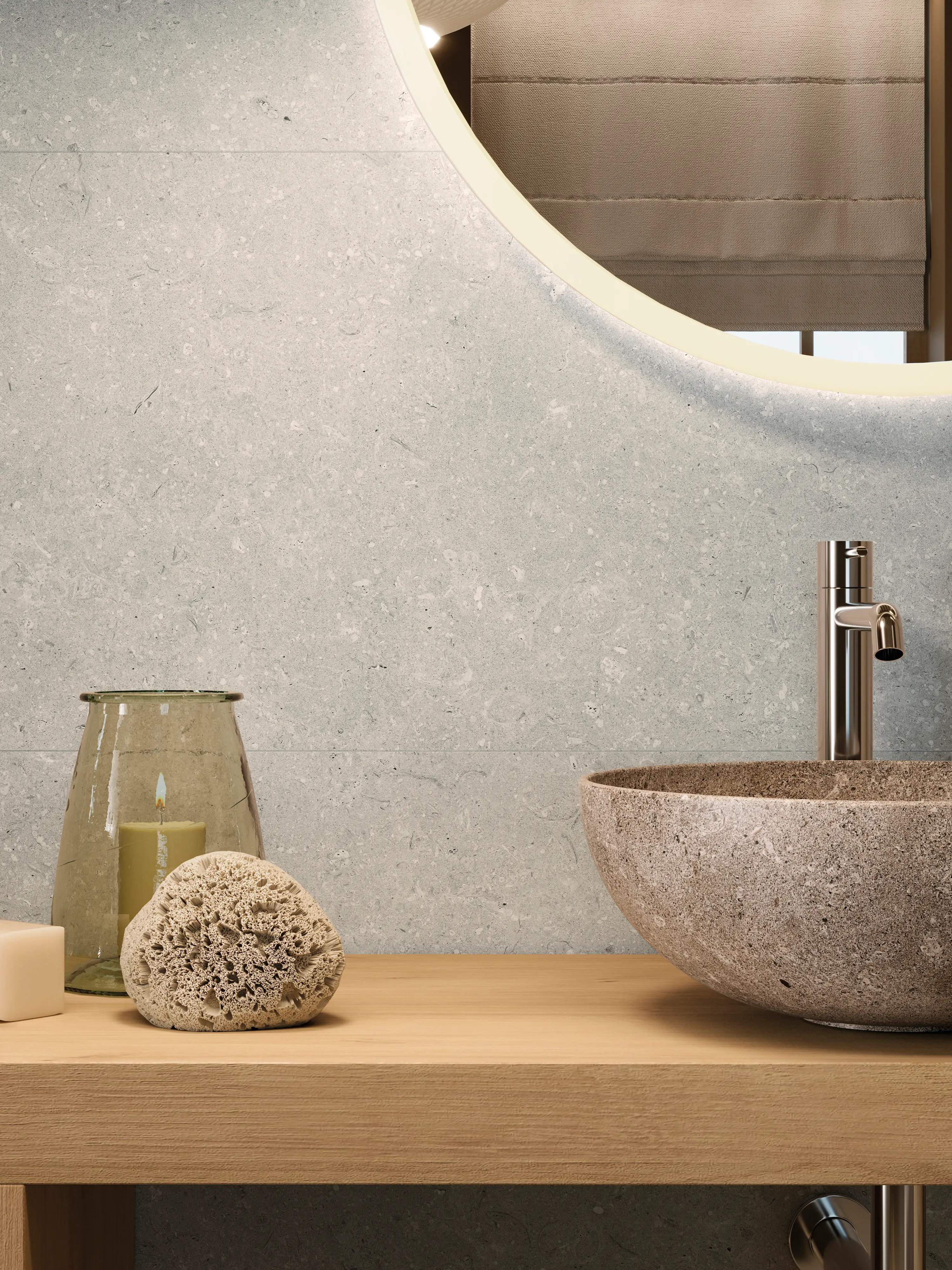 Format 25 x 44,3 cm jest bardzo uniwersalny: pozwala sprawnie wykończyć zarówno większe powierzchnie, jak i mniejsze łazienki, wnęki czy zabudowy. Dzięki estetyce inspirowanej kamieniem płytka tworzy tło, które łatwo zestawić z drewnem, czernią, bielą, chromem czy szczotkowanym metalem.