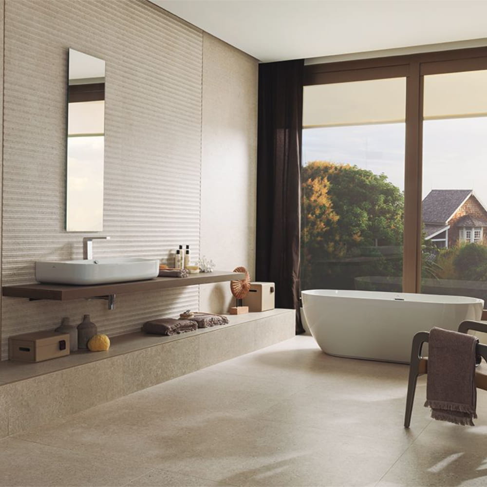 PRADA Caliza L to płytka o grubości 8,5 mm i formacie 59,6 × 59,6 cm – uniwersalnym, wygodnym do projektowania zarówno mniejszych, jak i większych pomieszczeń. Powierzchnia jest szkliwiona i matowa, co sprzyja łatwiejszej pielęgnacji i bardziej stonowanemu odbiciu światła.