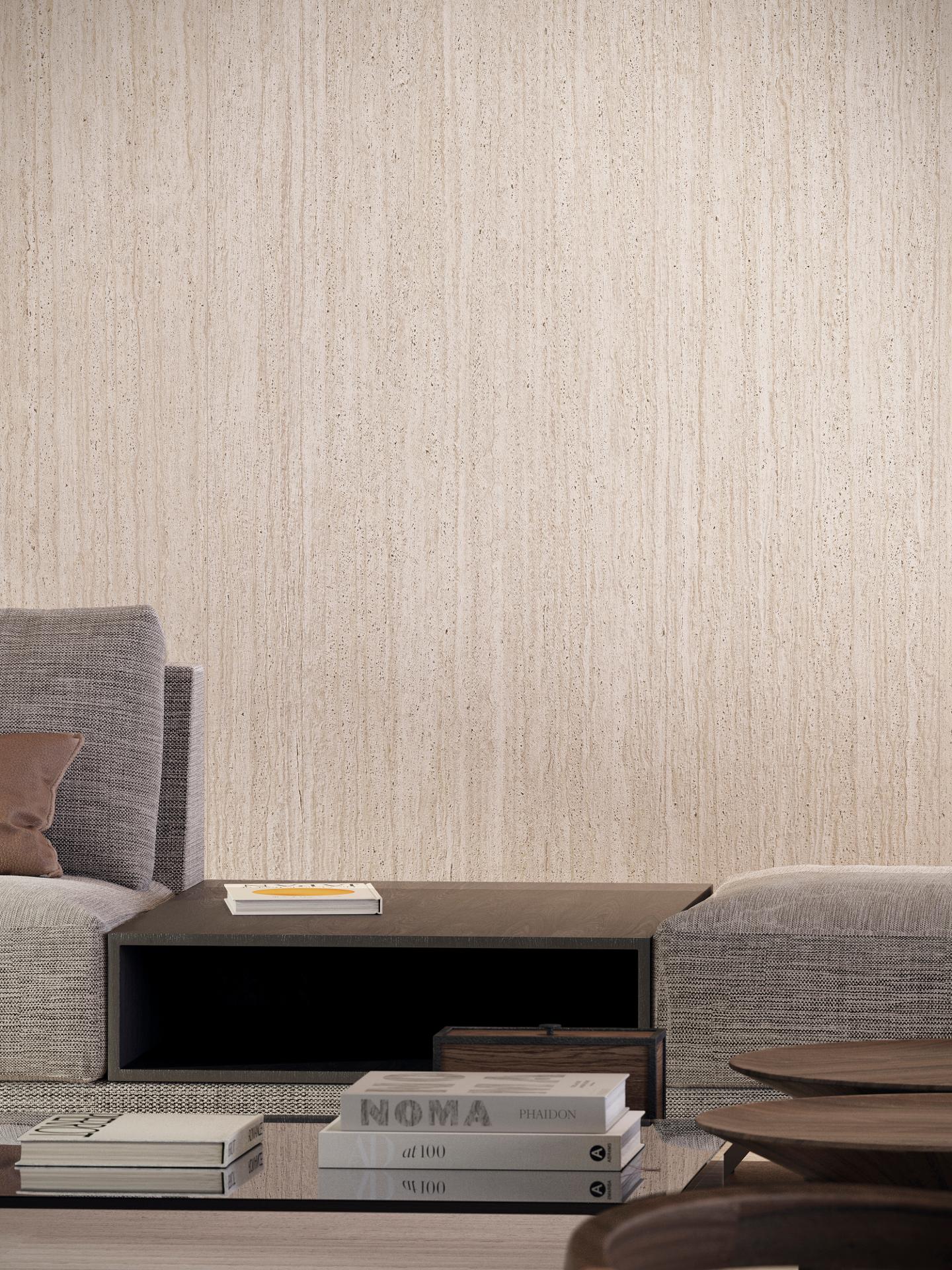 To okładzina ścienna w imponującym formacie 120 × 270 cm, która pozwala ograniczyć liczbę spoin, dzięki czemu ściana wygląda bardziej jednolicie, a cała aranżacja zyskuje efekt „tafli” kamienia. Wariant Tex.02 podkreśla dekoracyjny charakter powierzchni, dodając jej głębi i wyrazistości.