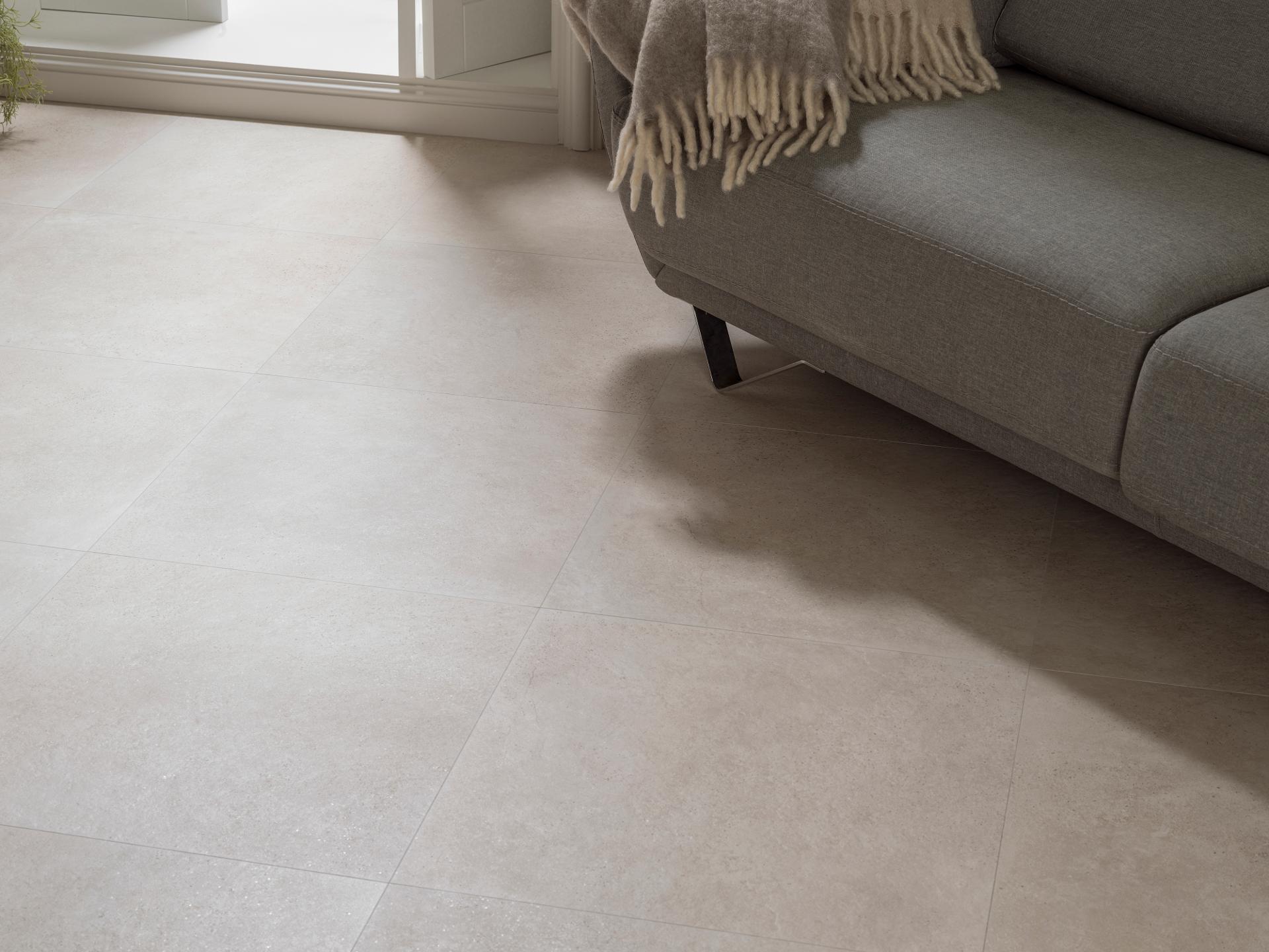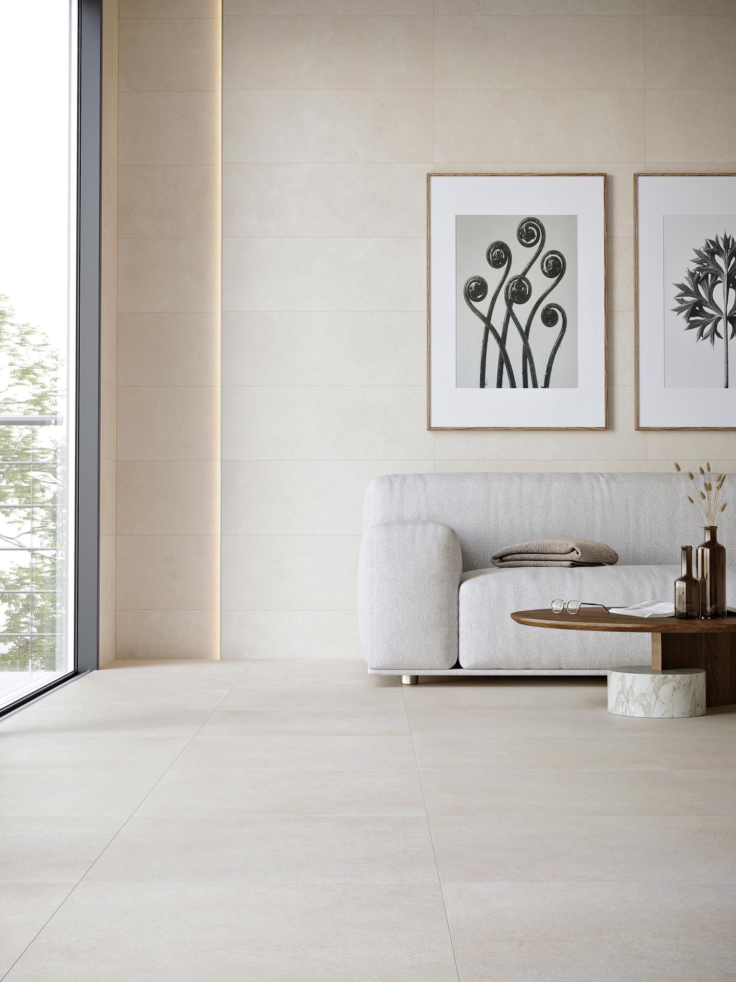 - Minimalizm: jasne, neutralne ściany + proste bryły mebli + cienka fuga w kolorze zbliżonym do płytki.